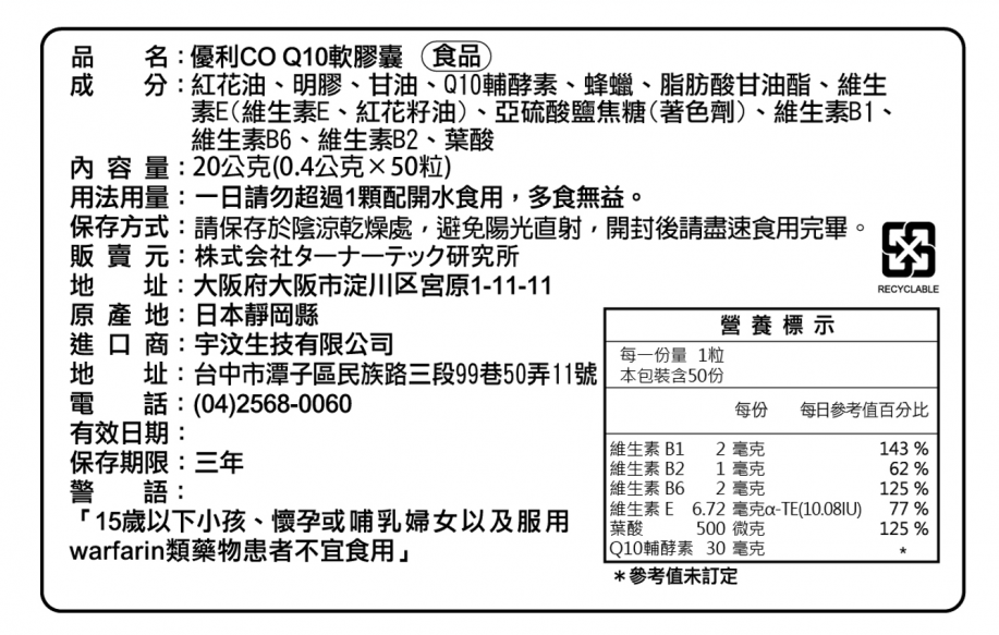 • 成分:紅花油、明膠、甘油、輔酵素Q10、蜂蠟、脂肪酸甘油酯、維生素E、